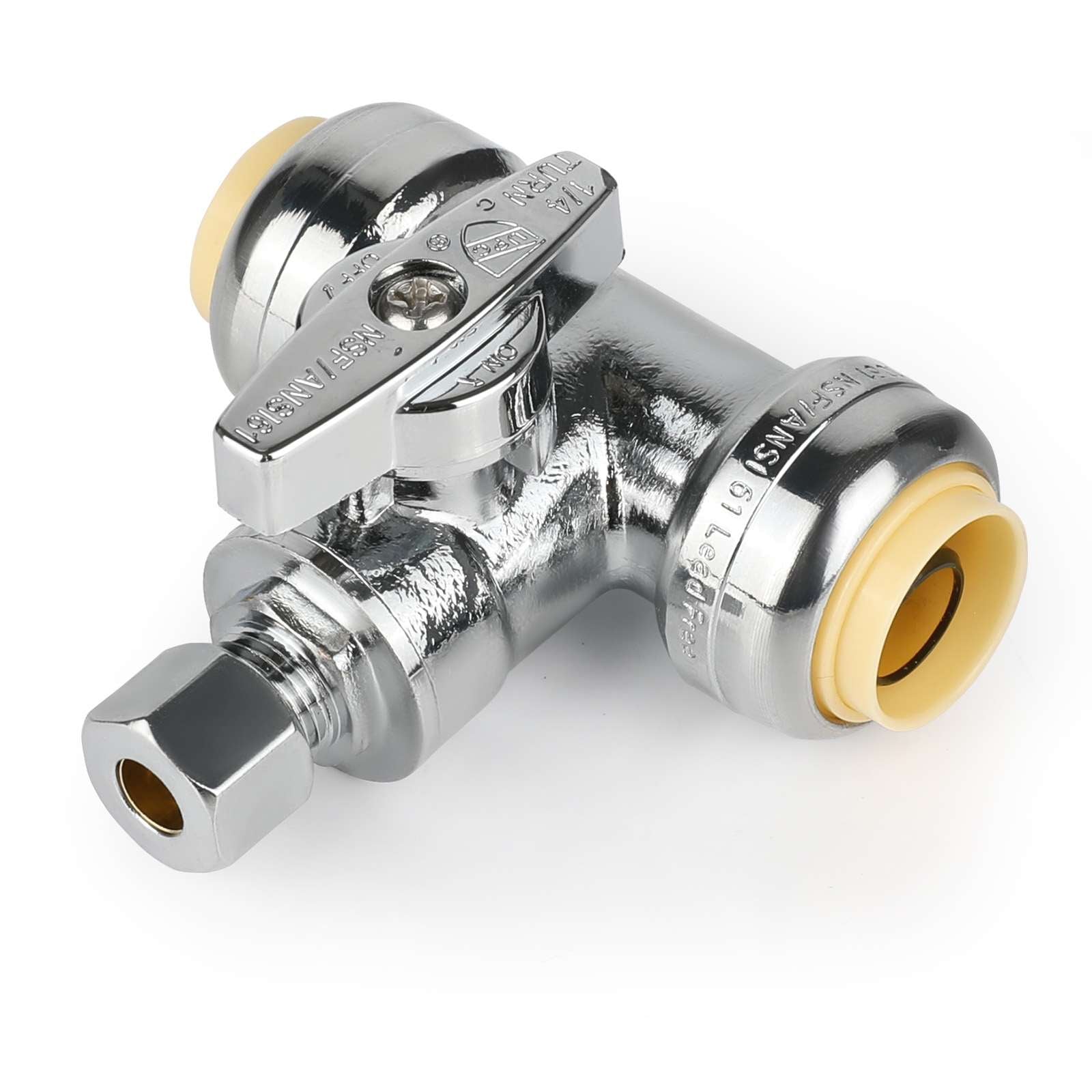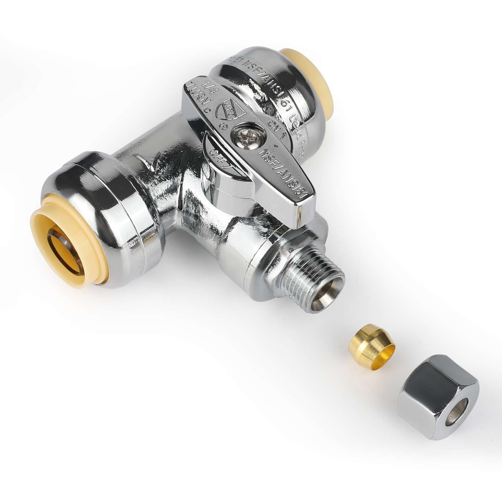 - Push Fit Tee Stop Valve 1/2" Push x 1/2" Push x 1/4" OD, 1/4 Turn, Water Shut Off Valve Chrome with a Disconnect Clip
