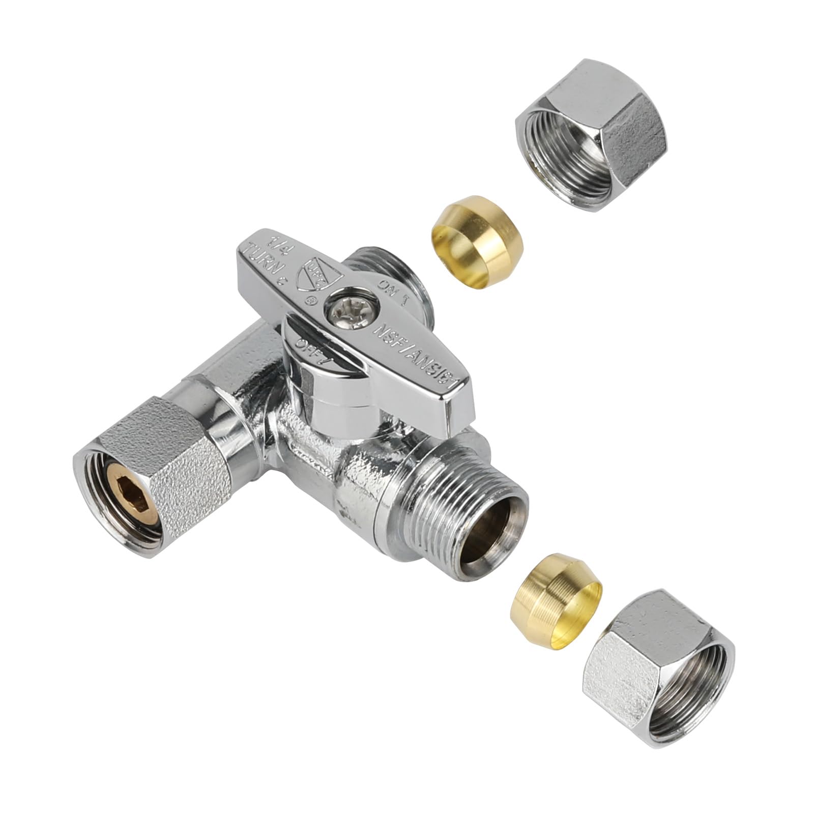 - 1 PC 1/4-Turn Stop Tee Valve 3/8" OD x 3/8" OD x 1/4" OD, LF Brass